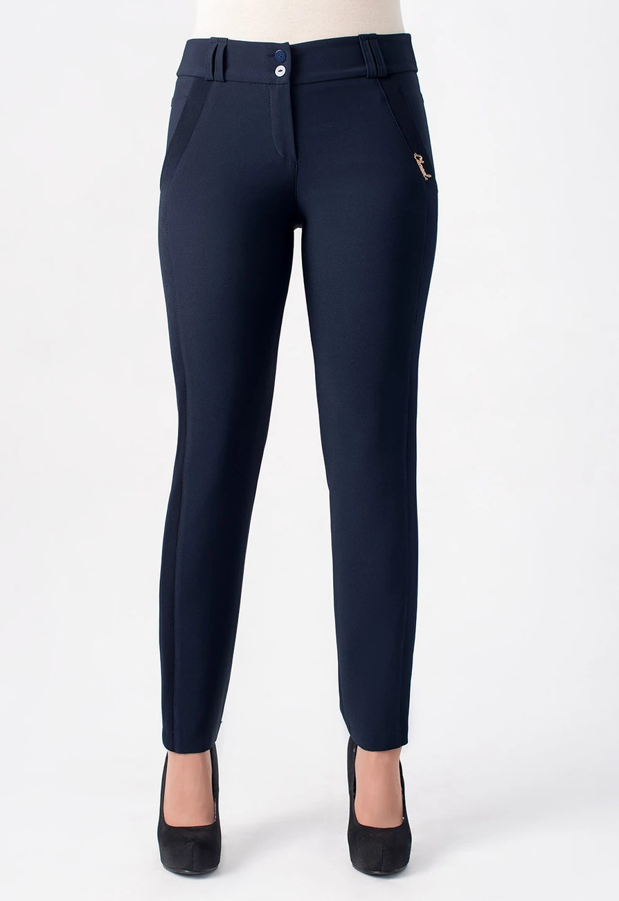 Женские брюки зауженые с высокой посадкой синего цвета с темными